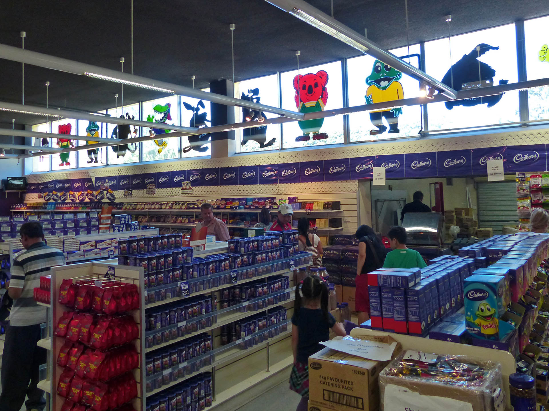 Zurück im Auto empfahl uns Foursquare die Cadbury Schokoladenfabrik in Claremont zu besuchen. Diese lag zwar wieder ein Stück zurück Richtung Süden, jedoch soll das die einzige Cadbury Fabrik in Australien sein die man auch besuchen kann. Der Eintritt kostet $4 pro Person, dafür bekommt man noch eine kleine Tüte mit ein paar Schokoladenproben. Nach dem Eingang kommt man erst mal direkt in den Souvenierladen um vom Kuscheltier, über den Kugelschreiber bis zum T-Shirt alles mit Cadbury-Logo zu erstehen.